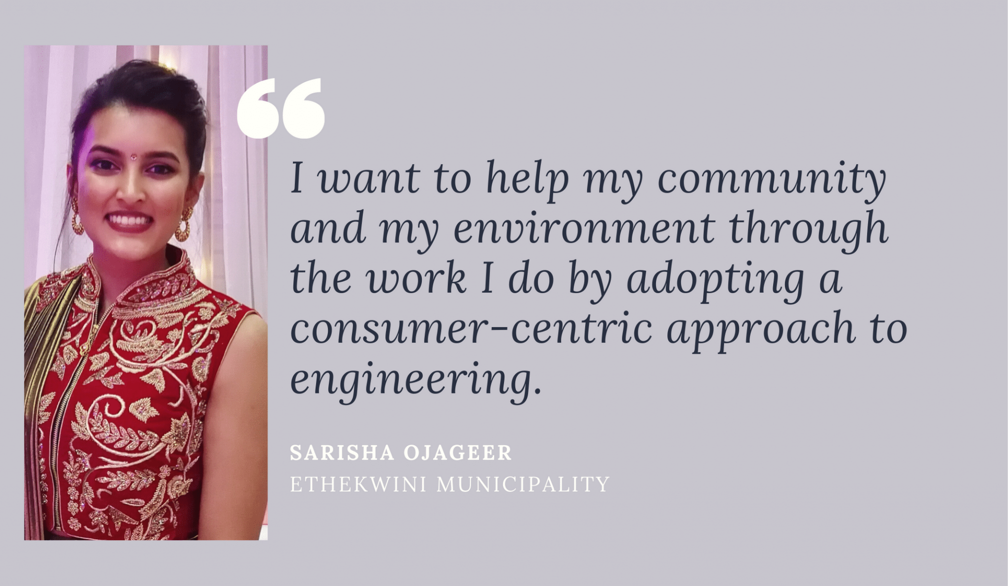 I want to help my community and my environment through the work I do by adopting a consumer-centric approach to engineering. What attracted me to work for the municipality is that every employee is, directly or indirectly, a provider of an essential service. At eThekwini Electricity we distribute electricity to our customers. And those customers are our families, our friends, our communities.