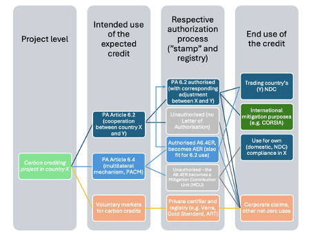 To better understand the relationship between the different mechanisms, it is useful to adopt the perspective of a project developer. From the viewpoint of project developers (e.g. a public or private entity developing an emissions reduction project expected to generate carbon credits), it is essential to understand the intended use of a carbon credit. This determines which entity must authorise it and what type of emissions reduction unit it will ultimately become. As said, methodologies in the creation of credits matter, as does the expected end-use of those credits. In theory, the same project developer can generate different credits for different end-uses, and choices will then be made based on price forecasts (thus, return on investment), access to the possibility of having the credits recognised as ITMOs (often through lengthy formalities and based on the country’s administrative capacity), and on specific demands from prospective buyers.