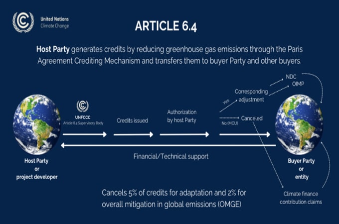 Article 6.4 establishes the Paris Agreement Crediting Mechanism (PACM), a carbon credit market that is centralised and supervised by the United Nations. The mechanism allows countries and private actors to implement emission reduction activities that can generate tradable credits, called PACM ERs (formerly known as A.6.4 ERs). These credits can be used by countries to achieve their NDCs or by other buyers, public or private, in voluntary carbon markets. The PACM is governed by a supervisory body appointed by the UN Conference of the Parties serving as the meeting of the Parties to the Paris Agreement (CMA). The supervisory body is responsible for developing rules, methodological standards, and procedures to account for emission reductions or removals, approving activities, and ensuring transparency and environmental integrity. Article 6.4 builds upon and improves the Clean Development Mechanism established under the Kyoto Protocol with stricter accounting rules and broader goals aligned with the Paris Agreement’s emphasis on sustainable development and increasing ambition over time.