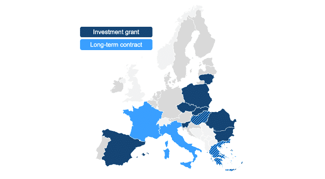 Third, these support schemes differed in the type of support granted. Eight MS offered only investment grants. Two MS (Greece and Hungary) offered both investment grants and 10-years Contracts-for-Difference (CfDs) based on “benchmark” reference battery market revenues. Finally, two MS (Italy and France) offered only long-term contracts. The Italian storage auction MACSE offers a fixed 15 years monthly premium in exchange for availability on the “time-shifting” platform.[6] France offered a bonus on top of the capacity market revenues, a form of CfD, granted for 5 years.