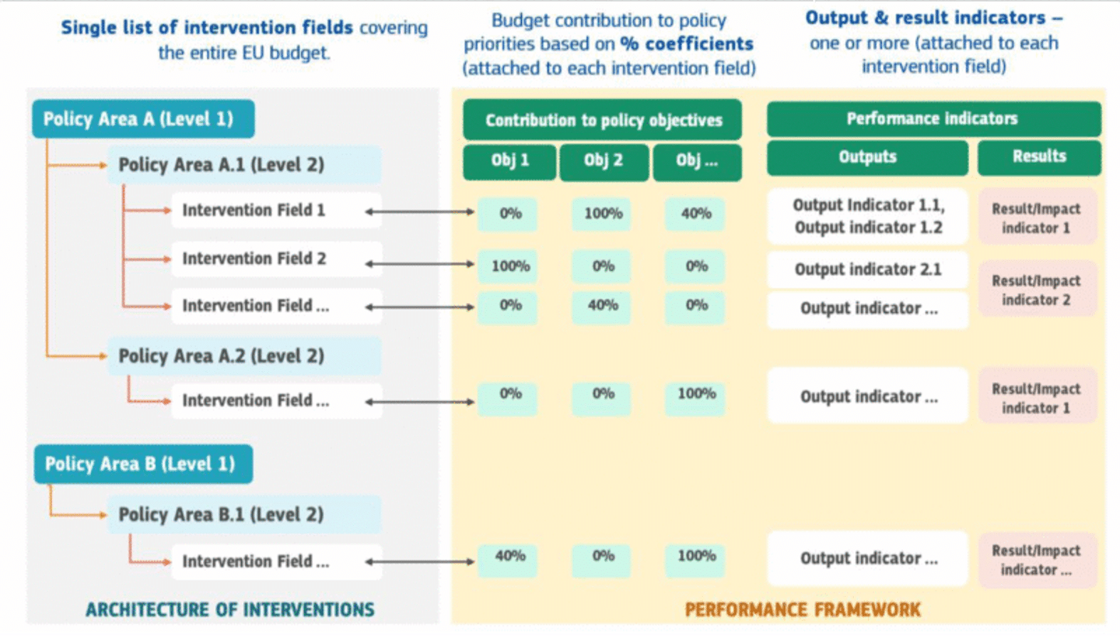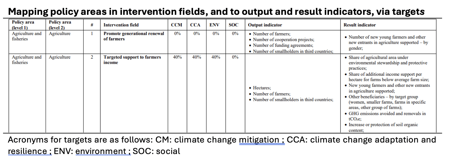 Each intervention field is linked to two distinct sets of indicators. The first is used for horizontal expenditure tracking. EU-wide coefficients are applied to each field to quantify contributions (‘targets’) to climate action, climate adaptation and resilience, environmental objectives, and social priorities. This allows the Commission to aggregate spending across all EU programmes and assess how far the overall EU budget is aligned with these cross-cutting priorities. In this respect, agricultural expenditure becomes fully comparable with spending under cohesion or other policy areas[10].
