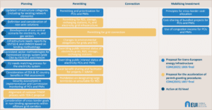 The main proposals and recommendations of the Package are grouped according to the high-level issues where changes are proposed (e.g. permitting for grid connection) and are mapped across four dimensions related to the development of energy infrastructure: planning, permitting, connection and mobilising investment. Without engaging in an evaluation of their possible impact, the mapping also indicates whether the measures will principally result in action at the EU level, rather than the Member State level.