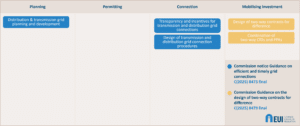 Figure 2 provides an overview of the two guidance documents of the European Grids Package. The main recommendations of the Commission Guidance on efficient and timely grid connections to both transmission and distribution networks are shown in blue. The suggestions provided by the Guidance on the design of two-way contracts for difference, which relates to Articles 19a and 19d of the Electricity Regulation, are coloured yellow. No European flags have been included in this mapping, as all the recommendations are addressed to the Member State level.