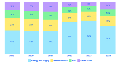 Figure 2. Breakdown of the weighted average final electricity price for households in the EU-27 between 2019 and 2024 (in %)