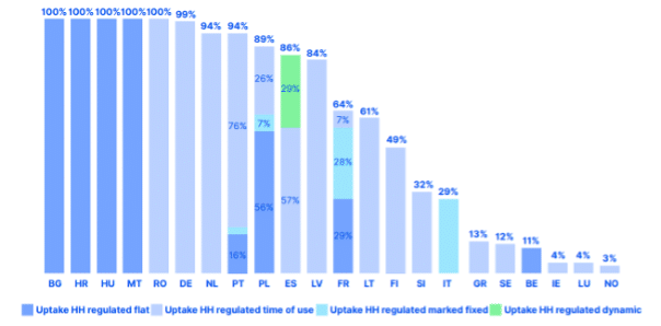 Action 1 of the Action Plan for Affordable Energy focuses on enabling consumers to switch to cheaper energy suppliers and to benefit from affordable energy while tackling energy poverty. Still, after the Clean Energy Package introduced legislative reforms to enable consumers to become active customers and benefit from demand response, 73% of households and a significant proportion of small and medium enterprises remain under supply contracts with fixed prices. Furthermore, the recent ACER report found that some Member States still have the majority of their household contracts under regulated flat prices or regulated time-of-use tariffs (Figure 3).